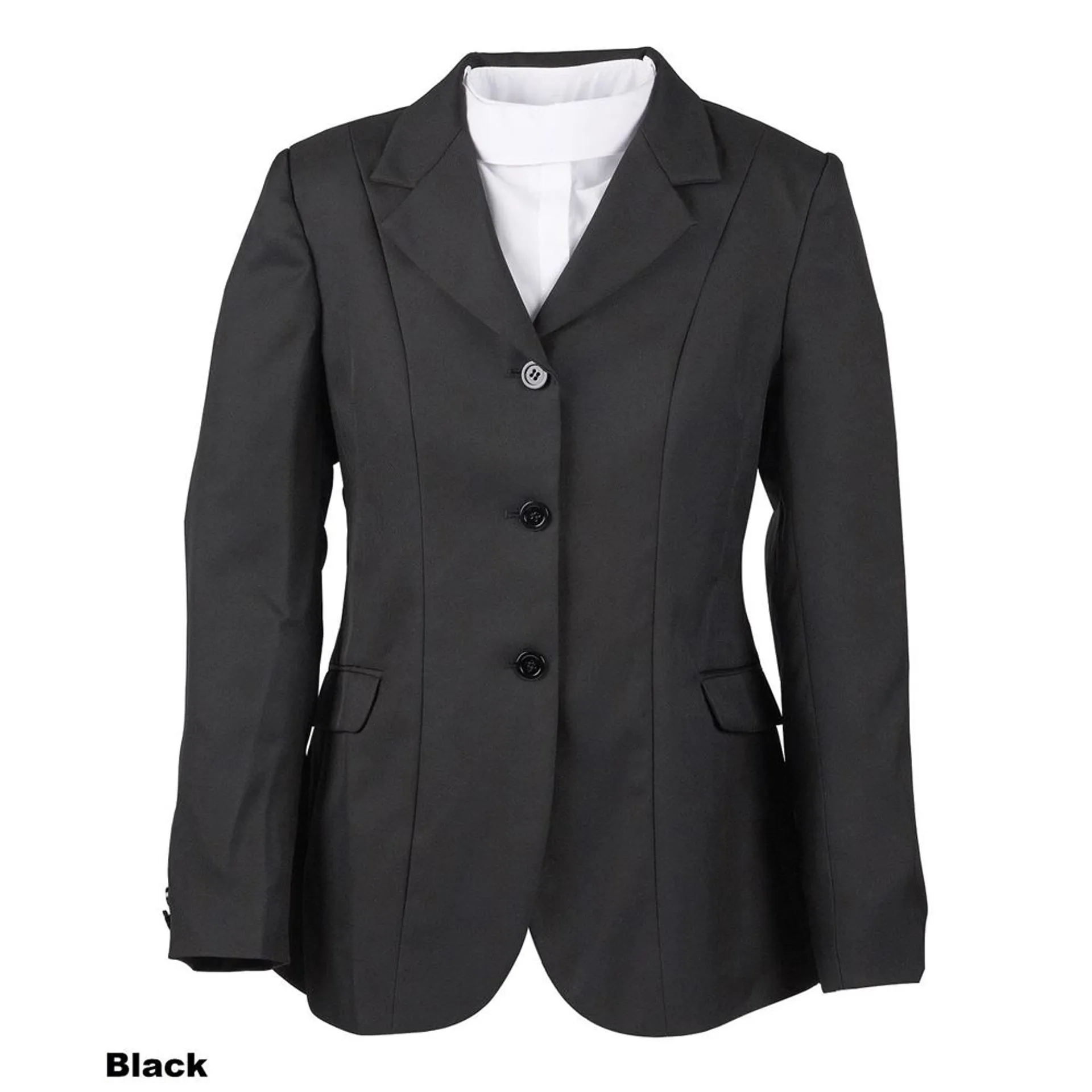 Traditional three button show coat in Polyester twill fabric. Flattering princess seam construction. Shoulder pads. Double vented back. Fully lined. Includes two front flap pockets. Machine washable for easy care. 100% Polyesyter