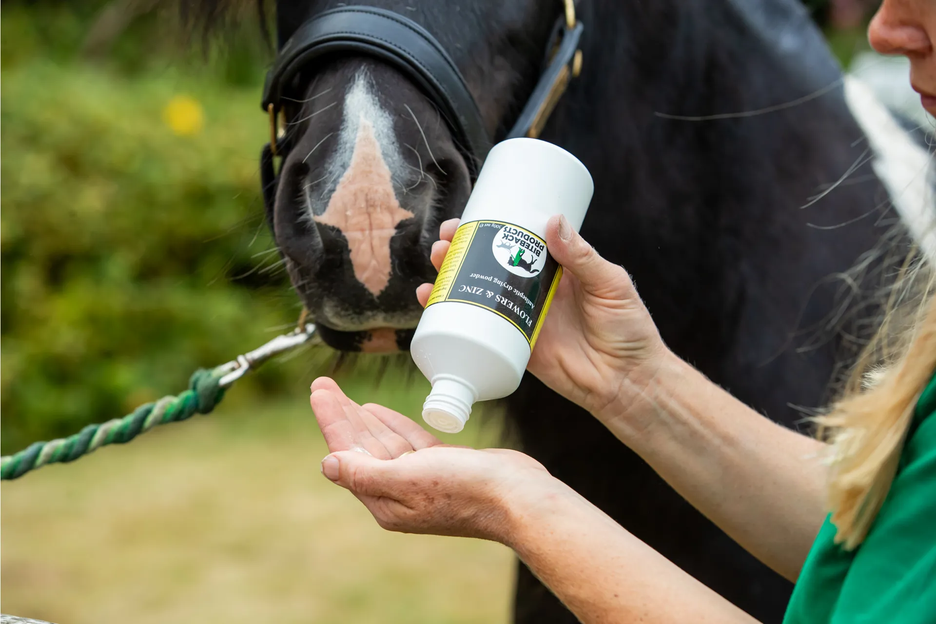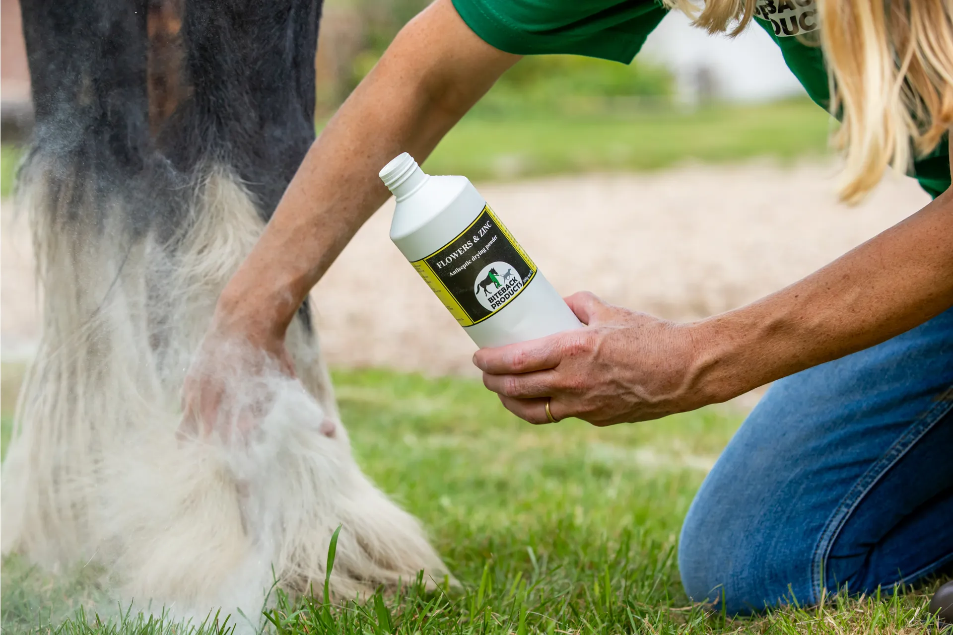 Biteback Flowers and Zinc antiseptic powder is ideal for cleaning and drying out the skin or hoof, so moisture is not trapped inside.