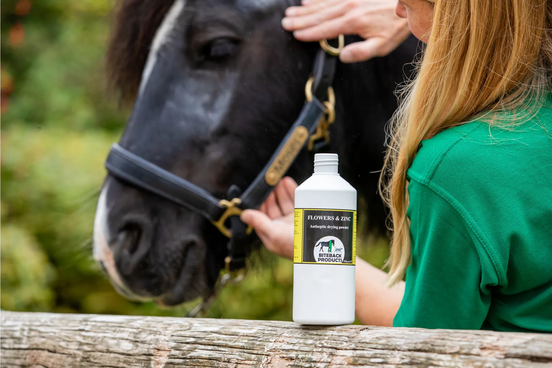 Biteback Flowers and Zinc antiseptic powder is ideal for cleaning and drying out the skin or hoof, so moisture is not trapped inside. It perfectly prepares the skin for a cream or lotion to be applied – they will adhere better and last longer.