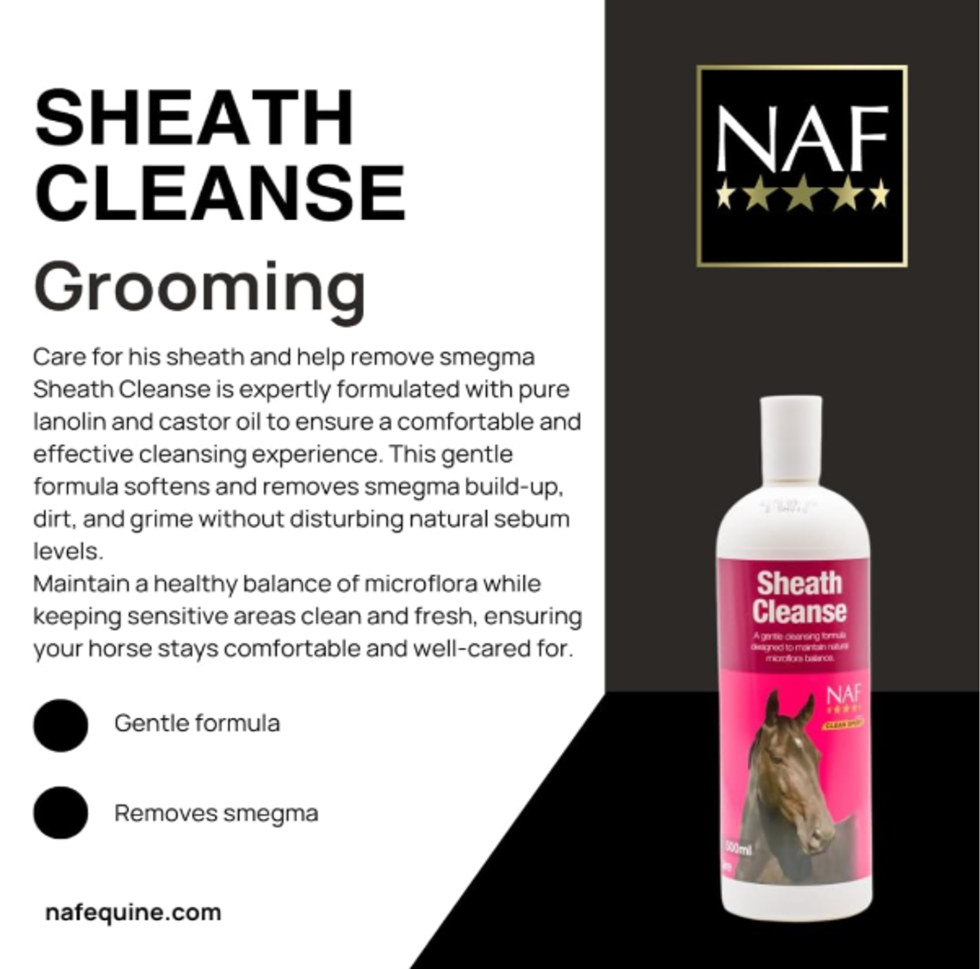 Cleanse your horse's sheath safely and effectively with NAF Sheath Cleanse. This gentle formula removes smegma, dirt, and grime without disrupting natural microflora.