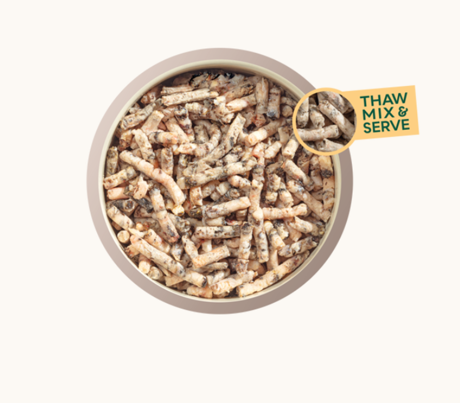 Each of our high quality ingredients has been carefully selected from trusted suppliers, then prepared and packaged into convenient frozen freeflow bags at our factory in Norfolk. Freeflow mince is a convenient way to prepare meals for your best friend - simply pour out the portion you require when you need it and leave to thaw.