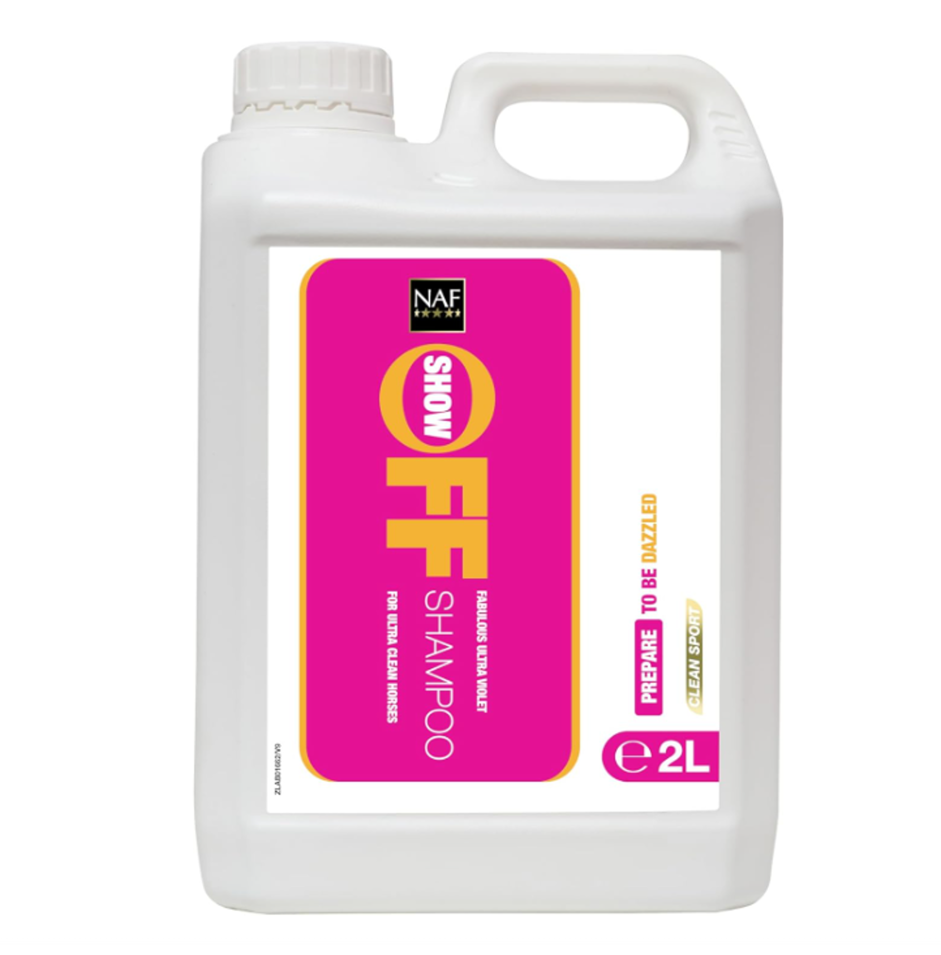 Add 20ml Show Off shampoo per litre of water, or apply directly to wet coat. Work into a lather for a deep conditioning wash and rinse well. Do not apply product to broken or irritated skin. Always rinse well with clean water after application. Replace lid after use. NAF recommend a small 24hr patch test prior to initial use. For animal use only. For external use only. Store upright.